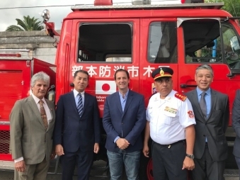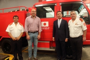 平成29年11月14日、ブエノスアイレス州キルメス市のキルメス市ボランティア消防署において、福嶌大使、パスクアル・キルメス市ボランティア消防隊理事長、パボン同消防隊長、モリ-ナ・キルメス市長、同消防隊関係者、マスコミ等の多くの方々の同席のもと、中古水槽付消防ポンプ車の供与式典が執り行われました。