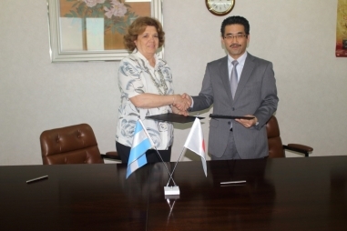 G/C署名した菱山臨時代理大使とレッタ理事長 |