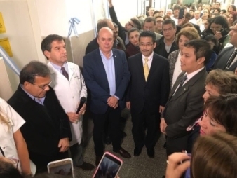 平成30年10月30日、ブエノスアイレス州サラテ市のビルヘン・デル・カルメン総合病院において、福嶌大使、ソト・ビルヘン・デル・カルメン総合病院協同組合長、ガスケ・ビルヘン・デル・カルメン総合病院長、エレーロ・アルゼンチン・トヨタ社長、同病院関係者、マスコミ等の多くの方々の同席のもと、外科用Cアーム型X線TVシステムの供与式典が執り行われました。