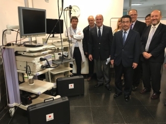 平成29年11月2日、サンタフェ州ロサリオ市のクレメンテ・アルバレス救急病院において、菱山公使参事官、ファレナ クレメンテ・アルバレス救急病院財団理事長、マルケティ・クレメンテ・アルバレス救急病院長、トグチ・ロサリオ日本人会会長、同病院関係者、マスコミ等の多くの方々の同席のもと、腹部超音波検査器、上部消化管内視鏡及び下部大腸等内視鏡の供与式典が執り行われました。